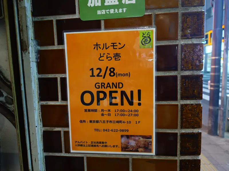 『焼肉DORA』の下階に新たな灯りがともり、「ここ何ができたの?」と気になる人が多いようです。2025年12月8日(月)に『ホルモン焼き どら壱』がオープンします。現地で分かった外観や掲示情報などをもとに、新店の様子をひと足先にお伝えします。