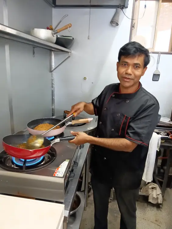 メニューは、ビリヤニとカレーが中心ですが、今回は迷わずお目当ての「チキンビリヤニ」を注文。(1,000円、マトンビリヤニは1,200円)マサラ(混合スパイス)、サフランなど数種のスパイスで味付けされたチキンとスープをフライパンで更に味付け。そして、ビリヤニに欠かせないのが細長いバスマティ米。こちらもすでに炊きあがったものを混ぜ合わせます。それらを大皿の中央に盛り、ゆで卵、味付けした赤い玉ねぎ、パクチーをのせ完成です。