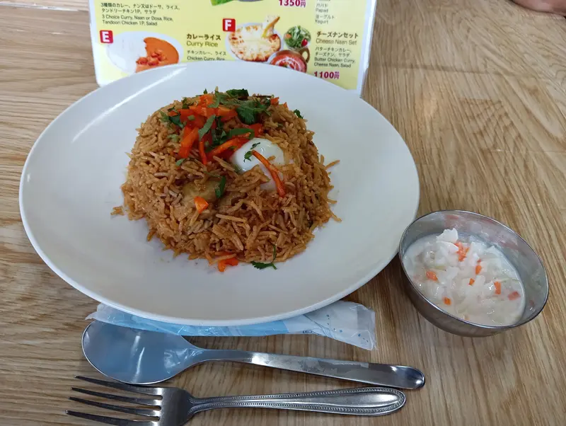 辛さは5段階、辛味が苦手な筆者はレギュラー(下から二番目)を選択。初めての味でした。スプーンが止まりません。水分の少ないお米ならではの食感、柔らかいチキンやゆで卵などのトッピング、特に別皿のライタと呼ばれるヨーグルトサラダとの相性が抜群です。
