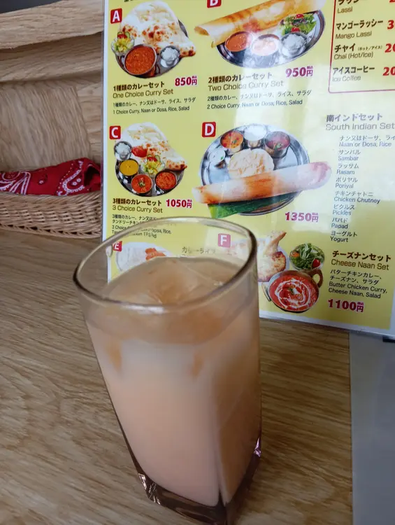 食後には、さっぱりしたマンゴーラッシー(300円)やチャイ(200円)がおすすめ。