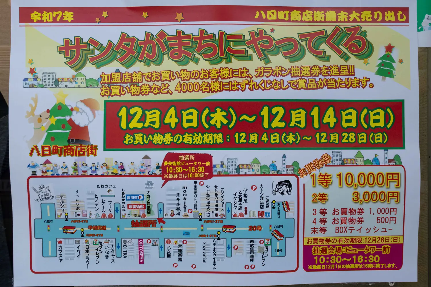 年末恒例、八日町商店街の歳末大売り出しが今年もスタート!加盟店でお買い物をすると、ガラポン抽選券がもらえるお楽しみイベントです。商店街はすっかり年末ムードに包まれています。2025年12月14日(日)までですので急げ〜!