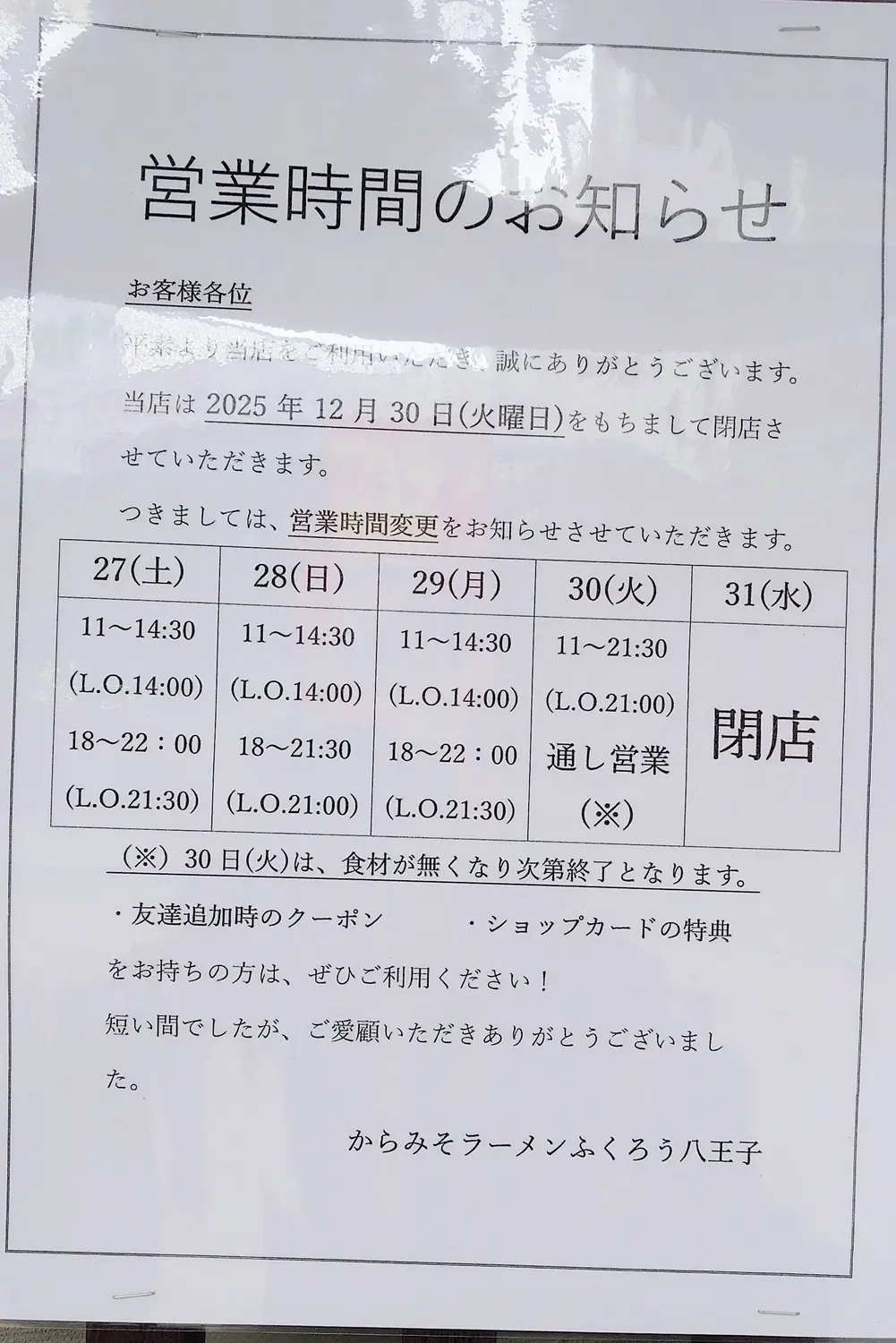 入口扉の右側に、「2025年12月30日(火)をもちまして閉店させていただきます」と書かれた案内が掲示されています。期間限定ラーメンの販売や割引企画は特に人気でした。2年間の営業に幕を閉じるのは残念です。