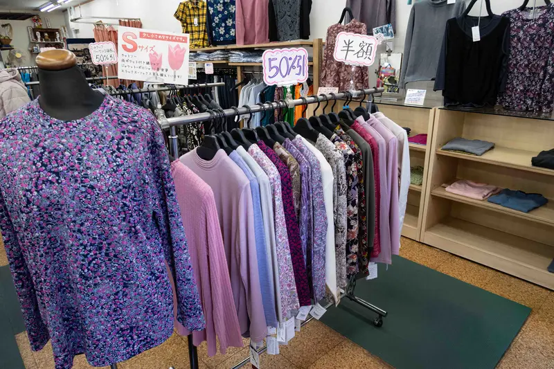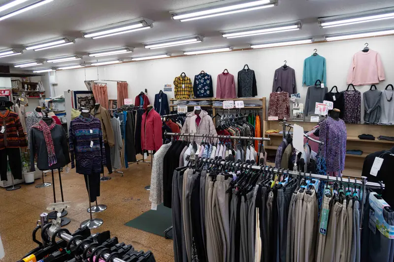 店内には、シニア世代を中心とした衣料品が並びます。普段着として使いやすいアイテムが多く、落ち着いた色合いや着心地の良さを重視した品ぞろえです。