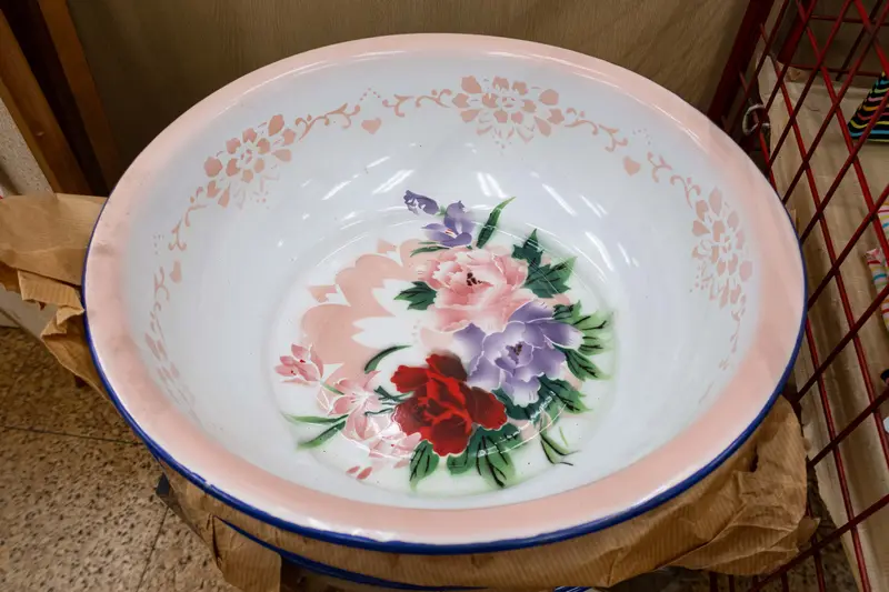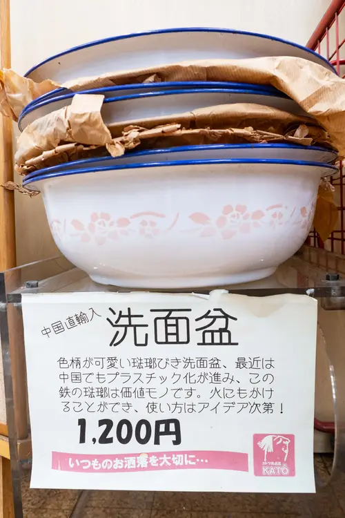 衣料品以外にも、店内で目を引いたのがこちら。中国から直輸入したホーロー製の洗面盆です。閉店セールで1200円→800円です!