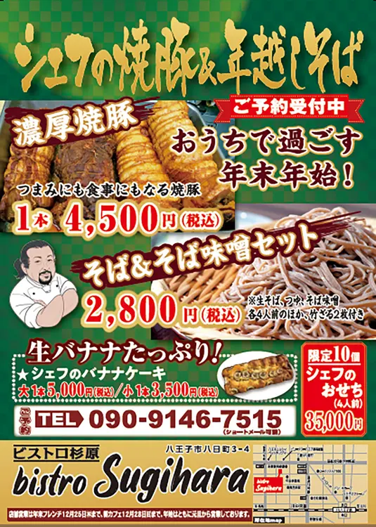 年末年始の食卓に、一流シェフの味を迎えてみませんか?現在『ビストロ杉原』では、焼豚・年越しそば・バナナケーキ・おせちの予約を受け付けています。
