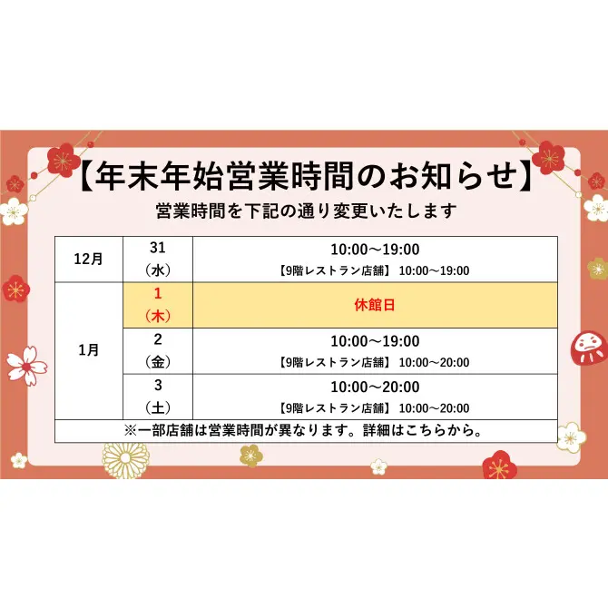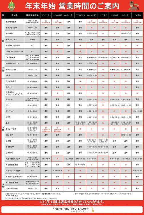 サザンスカイタワー八王子は、店舗ごとに年末年始の営業時間が大きく異なります。お出かけ前に、下記のチラシまたは公式サイトにて、各店舗の営業情報をご確認ください。