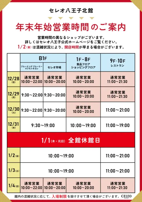 セレオ八王子北館は、2026年1月1日(木)が全館休館日となります。それ以外の日程については、店舗ごとに営業時間が異なるため、下記チラシおよび公式サイトにて詳細をご確認ください。