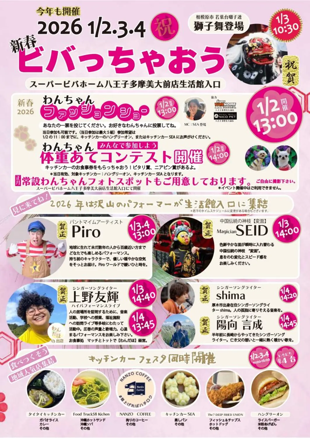 鑓水エリアで人気の『新春ビバっちゃおう』が今年も開催!期間中は、わんちゃんファッションショーやパフォーマーによるライブイベントを日替わりで実施。キッチンカーフェスタも同時開催され、お正月のお出かけにぴったりのイベントです。