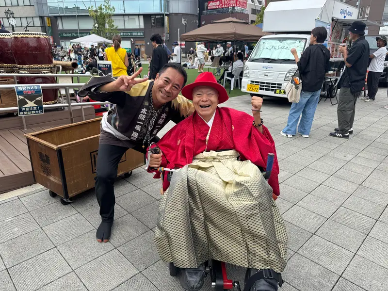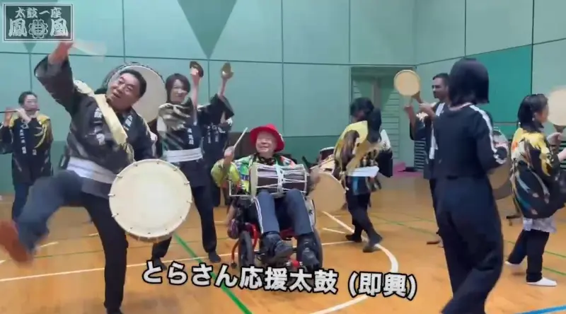 足こぎ車いすの「とらさん」と太鼓の「吉田さん」の出会いから。面白い(素晴らしい)出会いに遭遇しました。登場人物は、足こぎ車いすでホノルルマラソンなどに挑戦し続ける石井隆司さん(75・通称とらさん)と、よみっこオフィシャルスポンサーのアイワライフ(リフォーム)の吉田さん(50)。