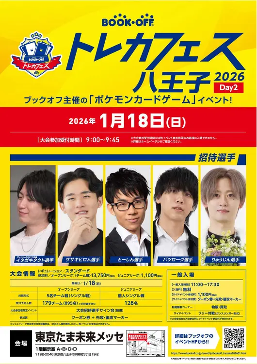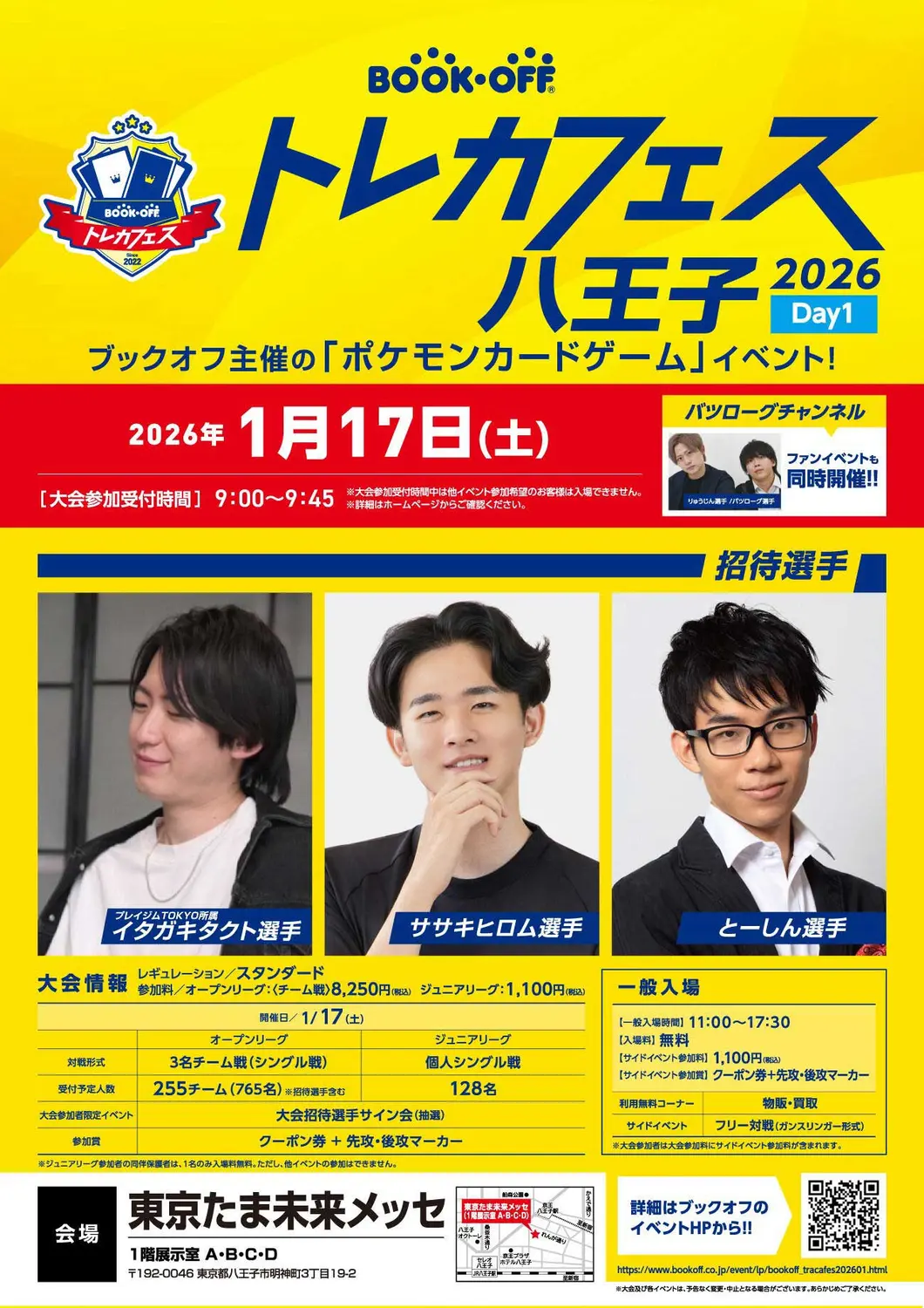 ブックオフ主催のポケモンカードゲームイベント『トレカフェス八王子2026』が2日間開催。Day1とDay2で大会形式や招待選手が異なり、両日楽しめる内容となっています。