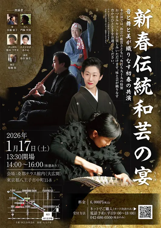 新春の晴れやかな空気の中、日本の伝統芸能と現代の感性が響き合う特別な催しが、八王子の「桑都テラス」で開催されます。伝統和芸の鑑賞に加え、地元の名店「角打ち十九」による特製おつまみセットも楽しめる、五感で味わうひとときです。