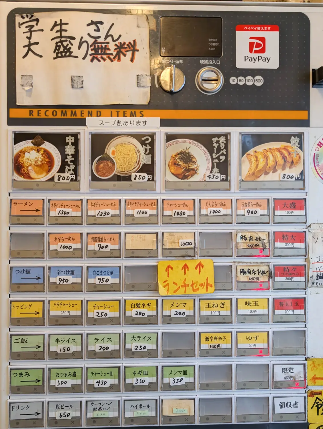 入ってすぐ右手に設置された券売機で食券を購入します。メニューは、王道の「ラーメン」と「つけ麺」を軸に、魅力的なトッピングがずらり。サイドメニューの『炙りバラチャーシュー丼』や『カレー』も気になりますが、今回はお目当ての『ネギラーメン』(1,000円)をポチり。