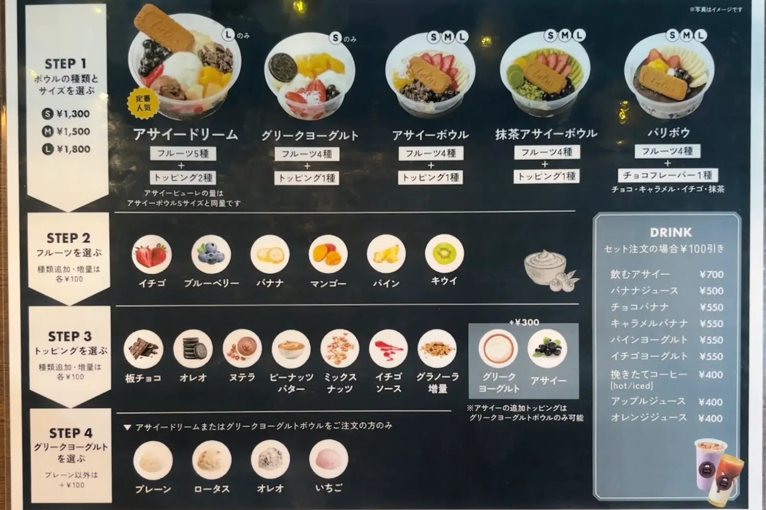 フルーツ5種類とトッピング2種、さらにグリークヨーグルトが付いた『アサイードリーム』は、もっともお得で人気のメニュー。