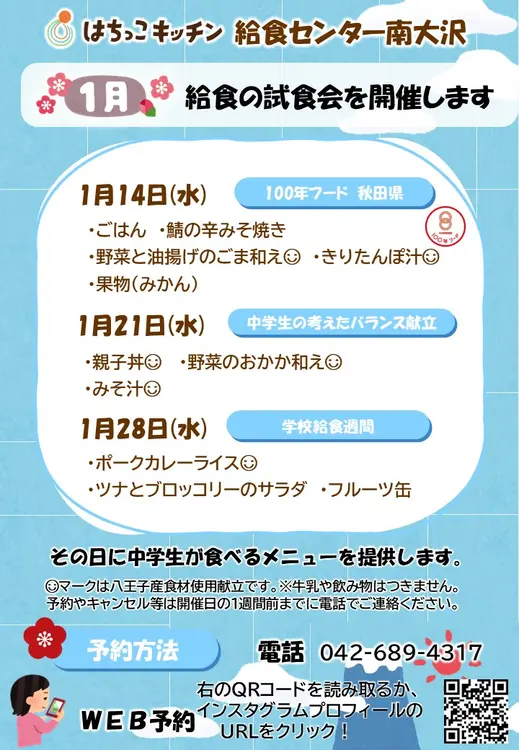 給食センター南大沢では、月に3~4回、中学校給食の試食会を開催しています。令和2年6月から給食提供を行っている同センターを見学し、平日に実際の給食を体験できます。時間は11:30~13:00、参加費は1食400円です。開催日の1週間前までに予約が必要となります。詳細は下記案内、もしくは公式HPをご確認ください。