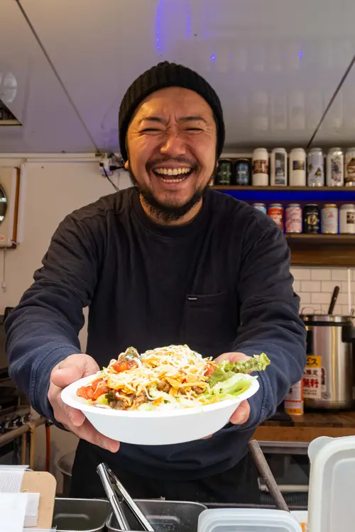 今回は『タコライス』を注文。でんの総料理長を務める千葉亮吾さんの、この笑顔!もうこの時点でおいしさが伝わってきますね〜