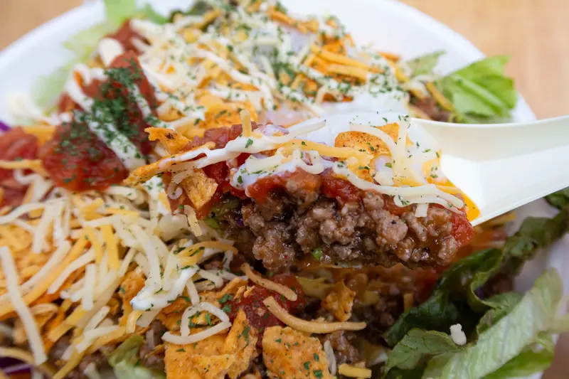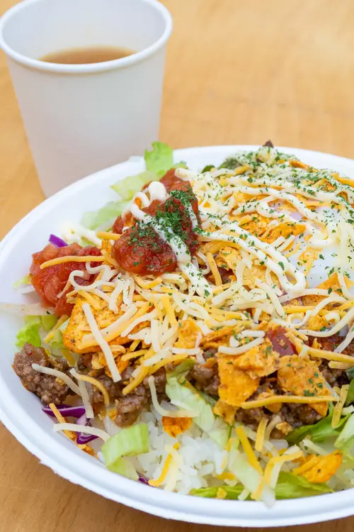ご飯の上には温玉、ひき肉、レタス、トマト、チーズ、トルティーヤチップスがたっぷり。見た目からしてボリューム満点です。