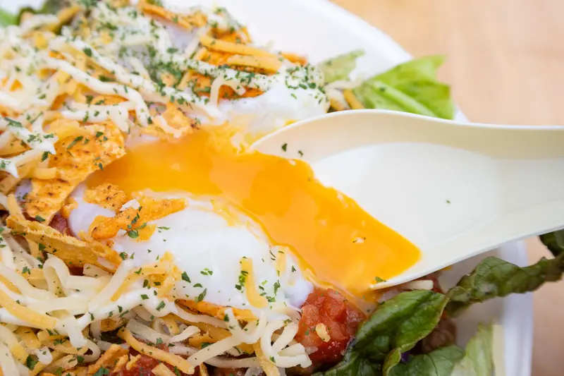 黄身を全体に絡めていただきます。サルサソースの酸味とスパイス感に、黄身が加わって味わいはぐっとマイルドに。ザクザクしたトルティーヤチップスの食感もいいアクセントです。