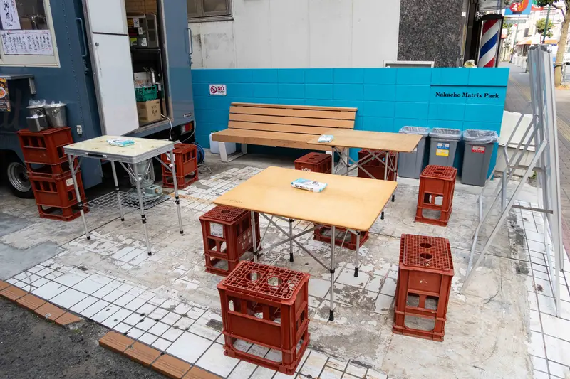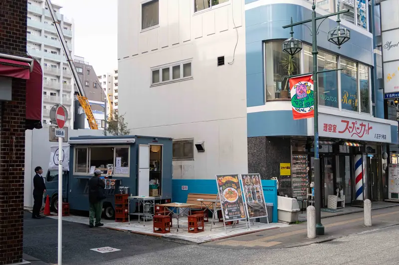 八王子駅北口から向かうと、『ジンギスカン羊羊』や『四十五寿司(だりめすし)』の並びにあります。中町マトリックスパーク内にキッチンカーが停まっていて、ドン・キホーテの裏手あたりです。