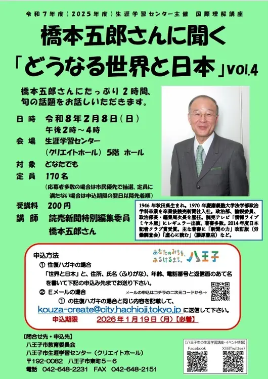 2026年2月8日(日)、八王子市生涯学習センター(クリエイトホール)5階ホールにて、国際理解講座「橋本五郎さんに聞く『どうなる世界と日本』vol.4」が開催されます。時間は14:00~16:00、定員170名。国際情勢や日米関係など、今まさに動く世界と日本の未来を読み解きます。申込締切は2026年1月19日(月)必着です。詳細は下記チラシ、もしくは公式HPをご確認ください。