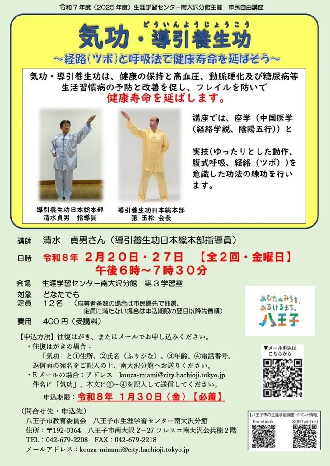 2026年2月20日(金)・27日(金)の全2回、生涯学習センター南大沢分館 第3学習室にて開催。中国医学の考え方と、ゆったりした動作や腹式呼吸を体験します。申込締切は2026年1月30日(金)必着です。詳細は下記案内、もしくは公式HPをご確認ください。