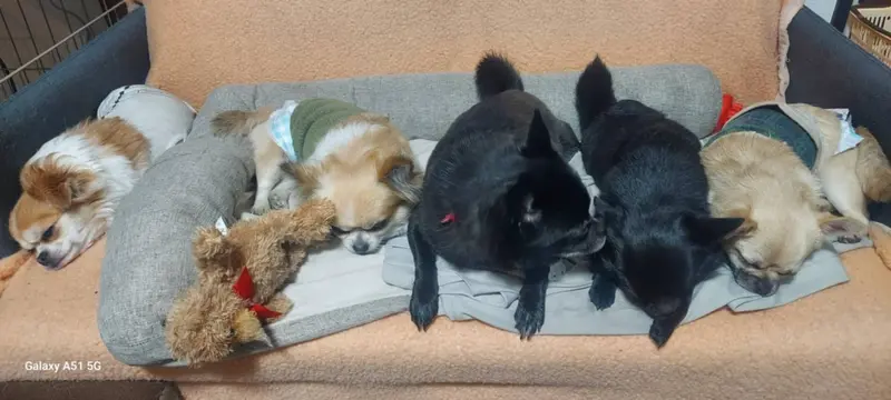 家族犬5匹で寄り添って寝ている姿に、胸がジーンとなりました。
