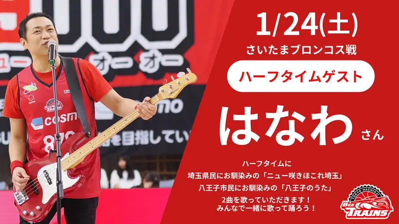対戦相手はさいたまブロンコス。さらに24日(土)には、八王子市民おなじみのはなわさんがゲスト来場!「八王子のうた」を会場で披露します。