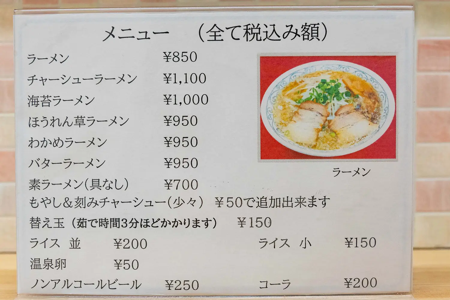 メニューはかなりシンプル。ベースとなる『ラーメン』(850円)に、トッピング違いでバリエーションがあります。『素ラーメン(具なし)』(700円)という選択肢もあって、ちょっと小腹が空いたときに良さそうですね。替え玉があるのも、九州ラーメンらしくてうれしいポイントです。