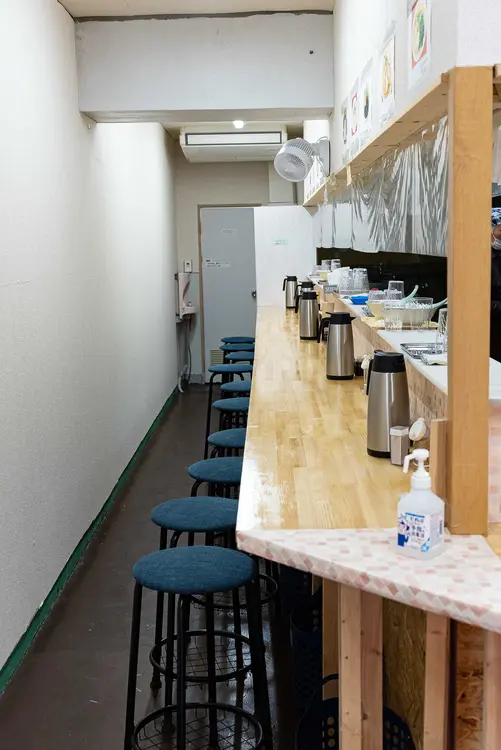 店内はカウンターのみで10席。入口側に少しスペースがあり、思った以上に開放感があります。窮屈さはなく、ひとりでも入りやすい雰囲気です。カウンターの中では、ご夫婦が二人三脚で調理を担当。阿吽の呼吸でテキパキとラーメンが仕上がっていきます。