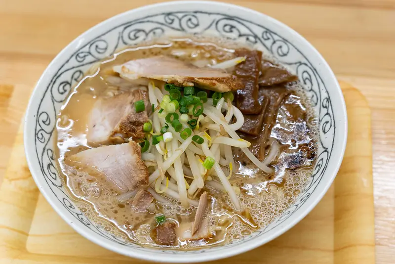 今回はベーシックな『ラーメン』を注文。まず目を引くのがチャーシューの量。大盤振る舞いでうれしくなります。トッピングはメンマ、もやし、小口ネギ、焦がしネギ。