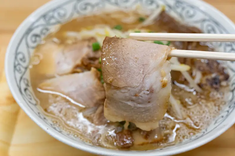 チャーシューは豚バラで、ほどよく脂がのっていて味はやや濃いめ。全体があっさり仕上げなので、いいバランスです。切り出しの大きさによって枚数は前後しますが、2〜3枚入るとのこと。もはやチャーシューメン級の満足感です。