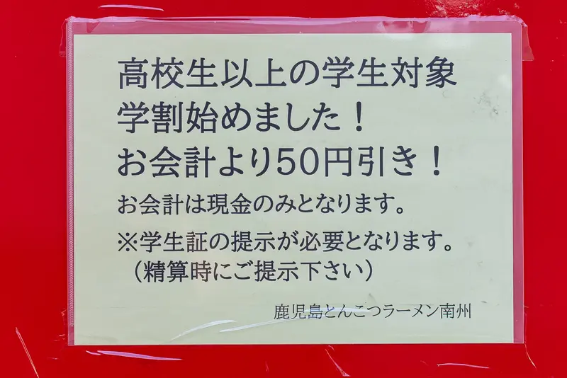 高校生以上は学生割引があり、会計から50円引き。学生証の提示が必要なので、忘れずに持っていきましょう。