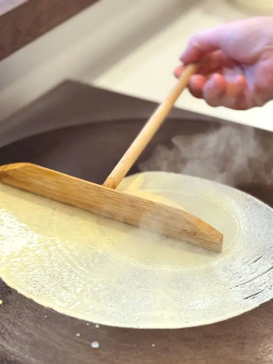クレープを焼き上げる鉄板と、生地を広げる「トンボ」を時計の針に見立て、この場所で積み重ねてきた時間を表現しています。