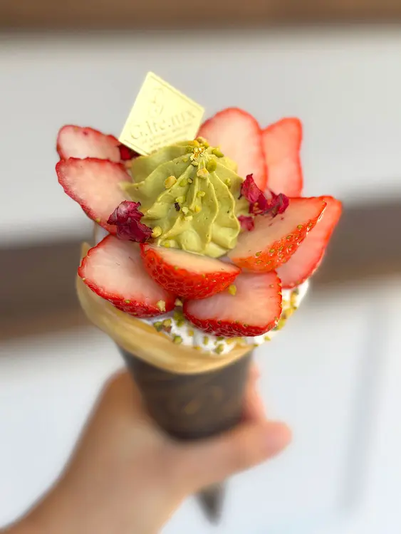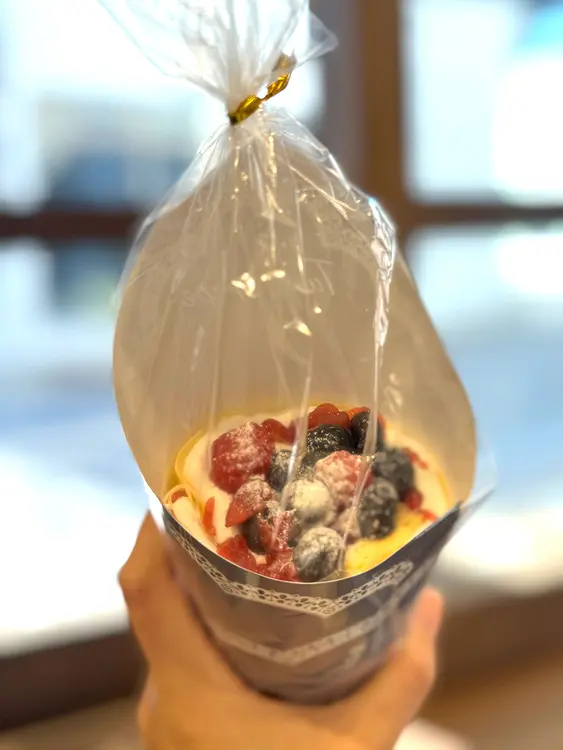 その季節にしか出会えない情景や、揺れ動く心情を、厳選された旬の食材で表現しています。それはもはやクレープの枠を超えた、「持ち歩けるパフェ」のような芸術品。素材本来の味わいを大切にした、パフェのように層を成す贅沢な仕上がりです。