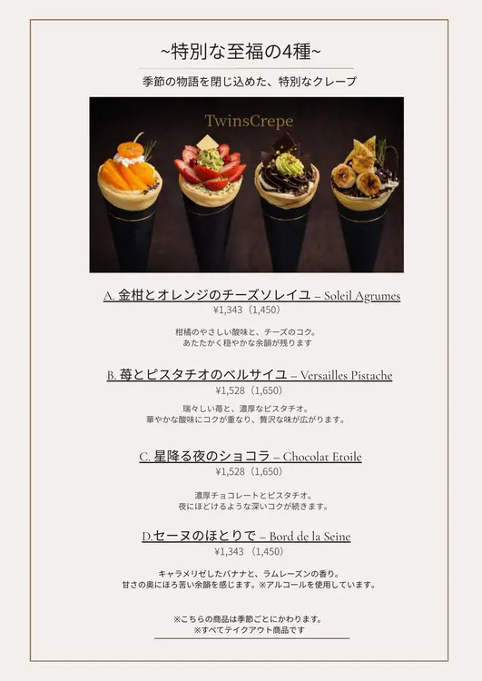 季節を映した詩集クレープも、大人のための洋酒クレープも、そして昔から変わらないクレープも。そのどれもが、この場所で積み重ねてきた時間の延長線上にあります。