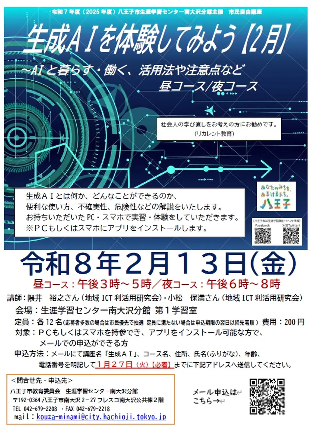 2026年2月13日、生涯学習センター南大沢分館で昼・夜の2コースを開催。PCやスマホを使った実習形式で、生成AIの基本を体験できます。申込期限は1月27日(火)必着。詳細は下記案内、もしくは公式HPをご確認ください。