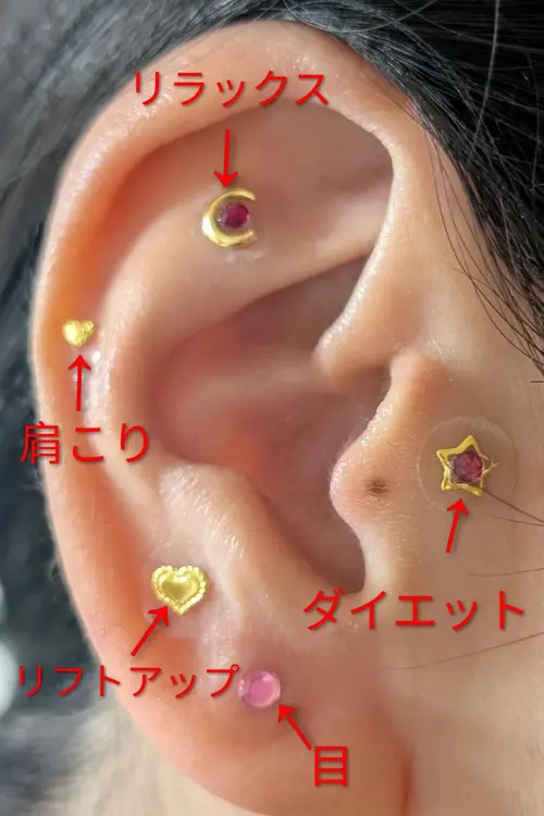 その後、好みや雰囲気に合わせて耳ツボジュエリーのデザインを選び、ツボに合わせて貼り付けていきます。
