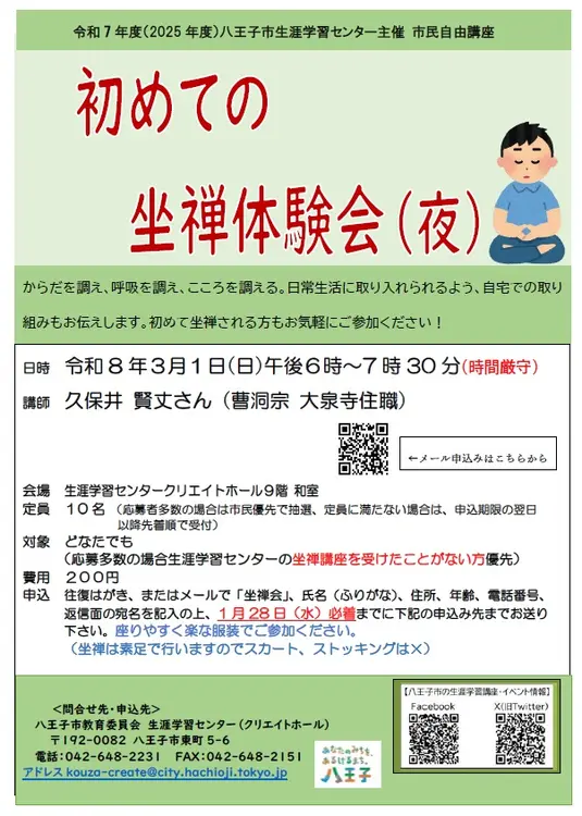 2026年3月1日(日)の夜、八王子市生涯学習センターで実施。少人数制で、初参加の方を優先。詳細は下記案内、もしくは公式HPをご確認ください。