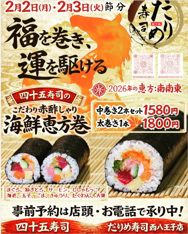 生本マグロや紅ズワイガニ、ぶり、えび、いくらに加え、今年は鰻も使用。海鮮の旨みを重ねた、より贅沢な味わいの恵方巻に仕上がっています。予約は店頭・電話・InstagramのDMにて受け付けています。