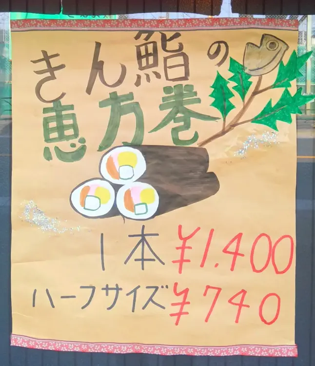 今年初挑戦となる『きん鮨の恵方巻』。径約5cm×長さ20cmで1,400円、小さめのハーフサイズは740円です。予約制・数量限定・店舗受け取り限定となっており、受付締切は1月31日です。