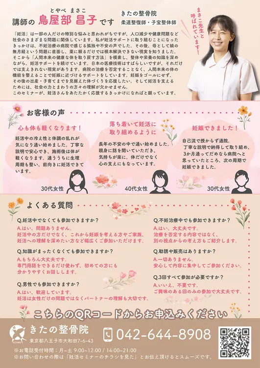講師を務めるのは、八王子市できたの整骨院を運営する鳥屋部昌子さん。柔道整復師・子宝整体師として、これまで多くの相談に向き合ってきました。