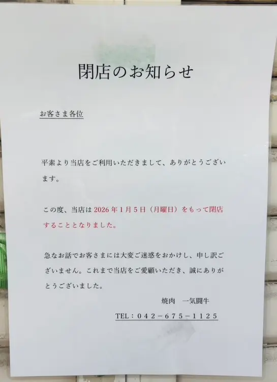 下柚木の焼肉店『一気闘牛』が2026年1月5日で閉店していたことがわかりました。
