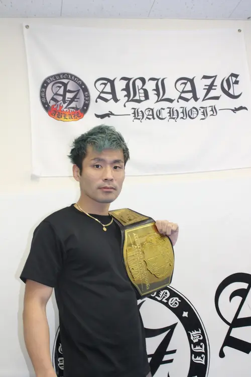 チャンピオンベルトとともに 格闘技ジム「アブレイズ」にて