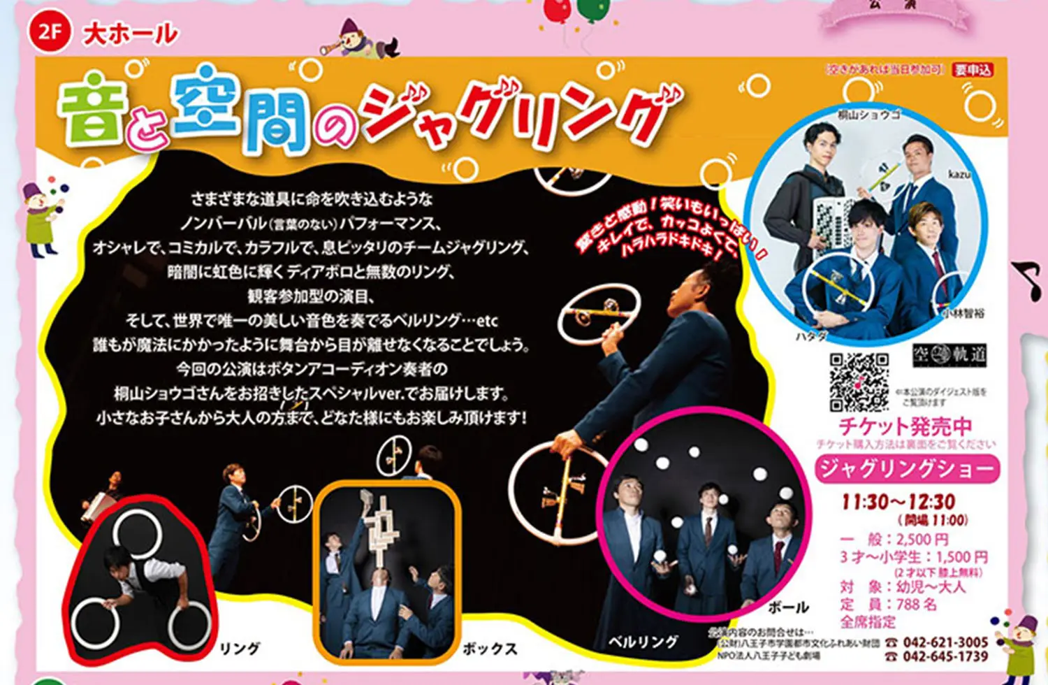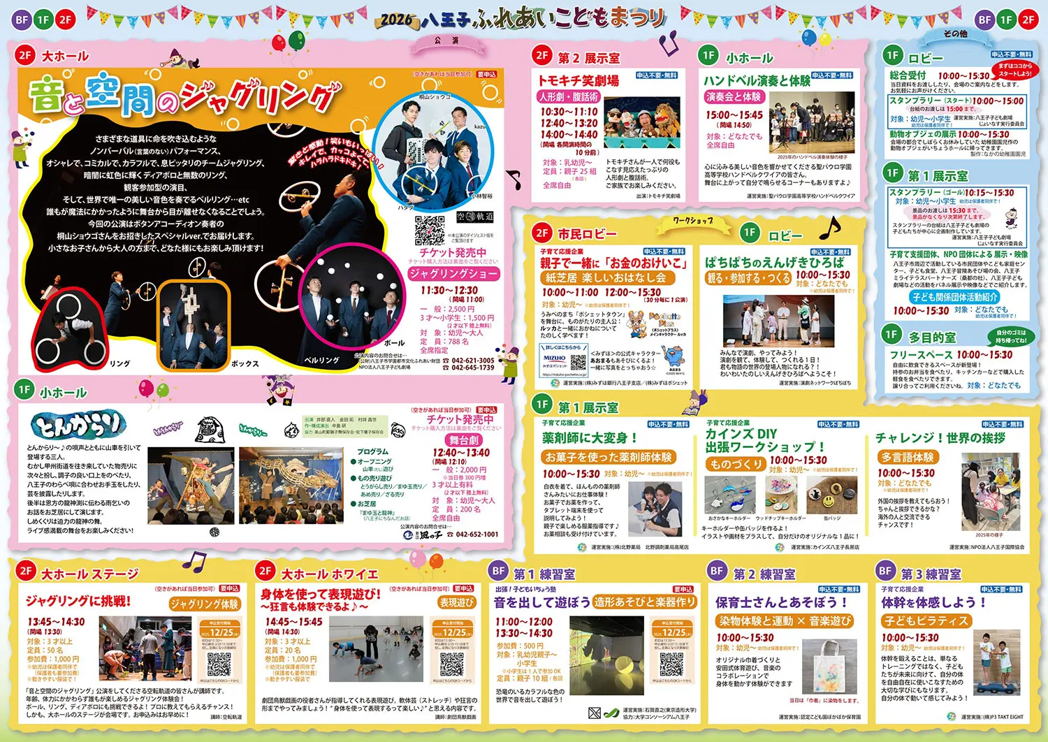 参加!体験!感動!子どもの思い出に残る夢いっぱいのイベント「2026八王子ふれあいこどもまつり」が開催されます。会場はリニューアルした八王子市芸術文化会館いちょうホール。ジャグリング公演や舞台劇、ワークショップなど、家族で一日楽しめるフェスティバルです。