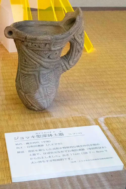 八王子市で出土したジョッキ型深鉢土器のレプリカ展示も必見。