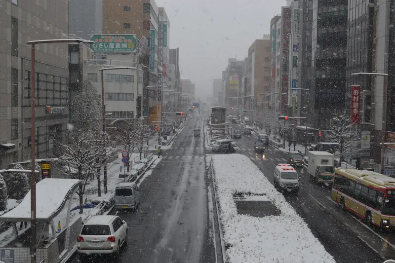 号砲が鳴るはずだった9時頃の八王子駅前はすっかり雪景色