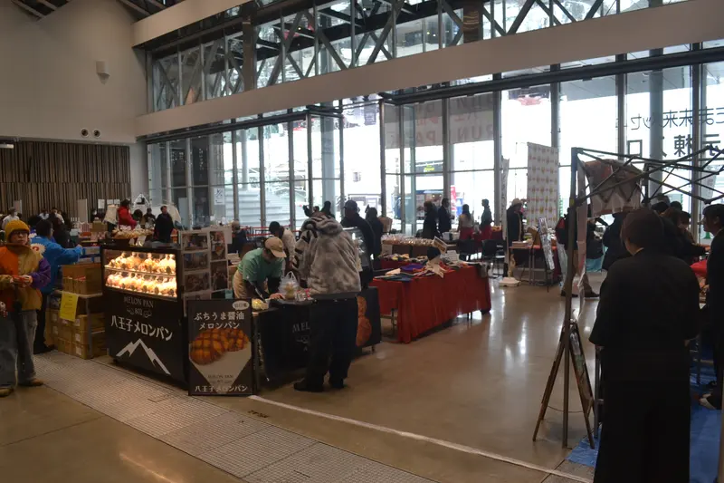 一方で、今年から初開催の応援マルシェイベント「八王子夢街道RUN×PARK」は、東京たま未来メッセとえきまえテラスで予定通り開催されました。本来であればレース後のランナーたちで賑わう会場も人気はまばら。それでも飲食を中心に物販、リラクゼーションなど50近いブースが出店し、ステージではクイズ大会やダンスショーも行われるなど、天気が落ち着いた午後からは賑わいを見せました。
