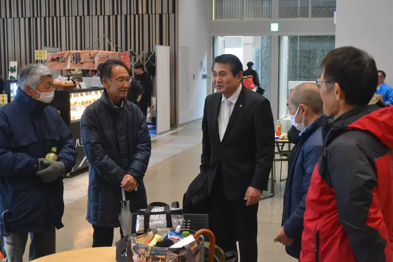 出店者の労をねぎらう初宿和夫市長