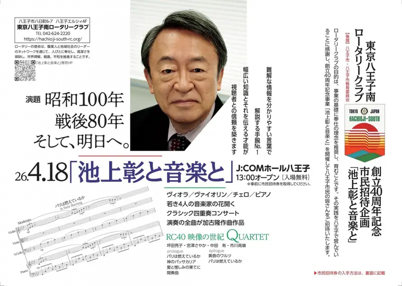 東京八王子南ロータリークラブ創立40周年を記念し、市民1,500名を無料招待する特別イベント「池上彰と音楽と」が開催されます。戦後80年、そして昭和100年という節目に、講演と音楽を通して未来を考える貴重な企画です。