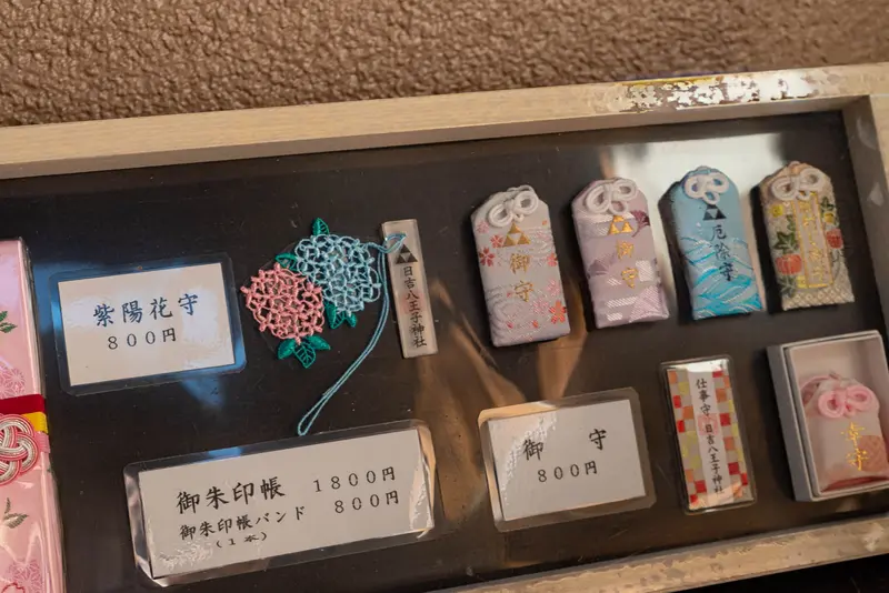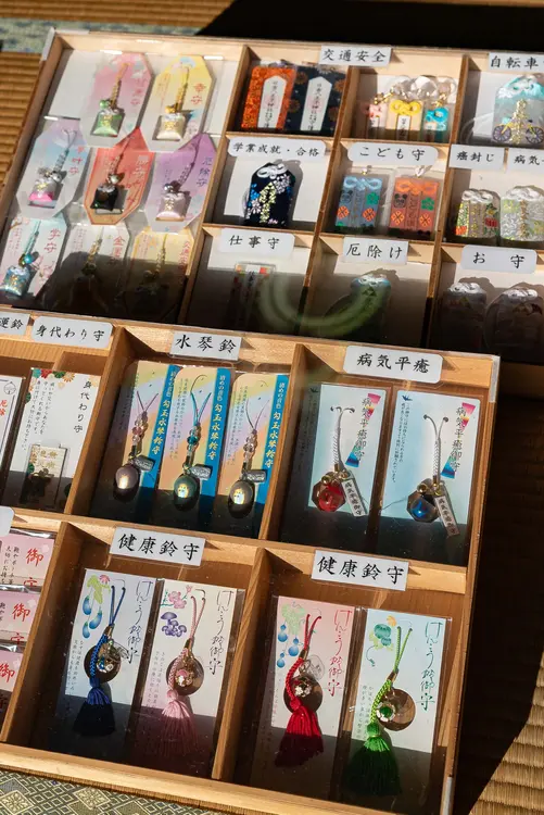 社務所には種類豊富なお守りが並んでいました。交通安全や健康祈願など、用途ごとに選べるのもうれしいポイント。
