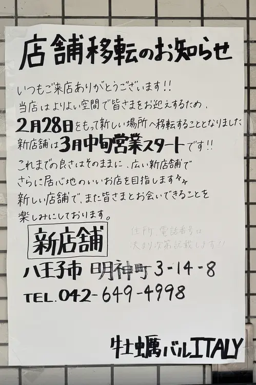 移転先は東京都八王子市明神町3-14-8と現店舗より広くなるそうです。そして、オープンは3/13(金)に決まったそうで期待が高まります。移転先の詳細などはInstagramでご確認ください。
